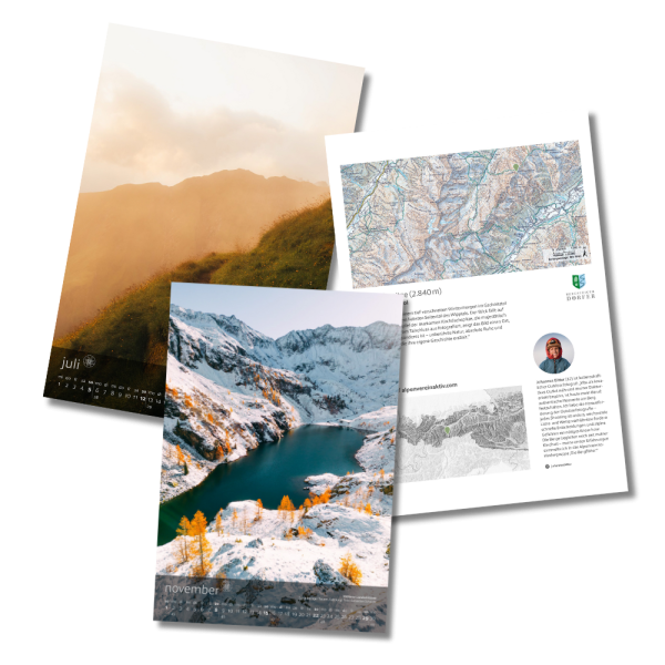 Info: On the back of the calendar pages you will find interesting facts about the mountains/regions depicted and maps with a tour tip. You can also use the information linked in the respective QR code on alpenvereinaktiv.com to plan the approach and your individual mountain adventure. We wish you wonderful experiences in the mountains.